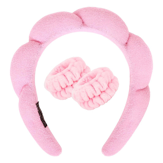 Pink Skincare Headband and Wristband Set for Washing Face, Makeup, Spa - Bubble Puffy Terry Cloth Soft Sponge Clouds Hair Accessories for Women