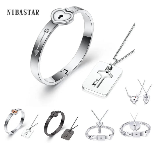 Stainless Steel Love Heart Jewelry Set - Elegant Lock & Key Pendant Necklace and Bracelet Combination