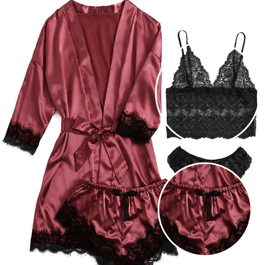 Summer 4 Piece Set of Women'S Lace Underwear Paired with Pajama Waistband Outer Robesexy Pajama Lace Patchwork Home Pajama Set